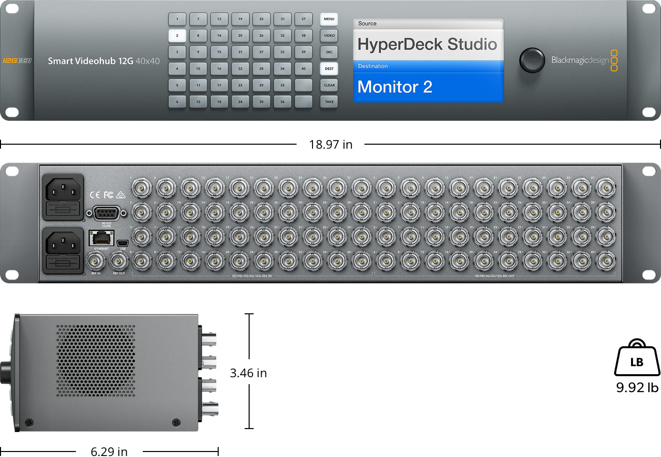 Buy Blackmagic Design Videohub 40x40 12G Zero-Latency Video Router featuring Zero-Latency Routing Switcher, 40 x 12G-SDI Inputs,40 x 12G-SDI Outputs, Supports Up to DCI 4K60 Video, Combines SD, HD, UHD 4K & DCI 4K Video, Push-Button, Knob & Ethernet Control, 2.2" Front Panel LCD Status Display, SDI Reclocking, 2 RU Form, Includes Videohub Mac/Windows Software.