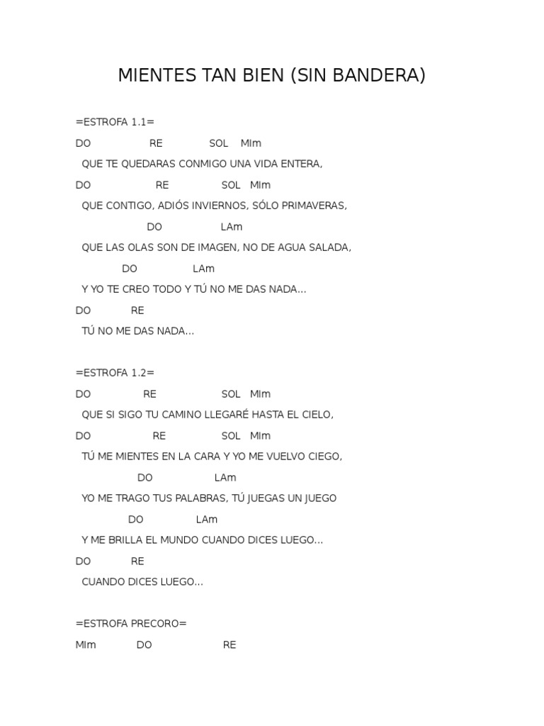 Mientes Tan Bien - Sin Bandera. Font. Chords. Simplify. Autoscroll. Transpose. Print. Report bad tab. AUTOR: Leonel García ALBUM: De Viaje (2003) Esta facil la cancion es una de las mejores.. es arpegiada cada acorde.aki les pongo estos acordes por si no se los saben.