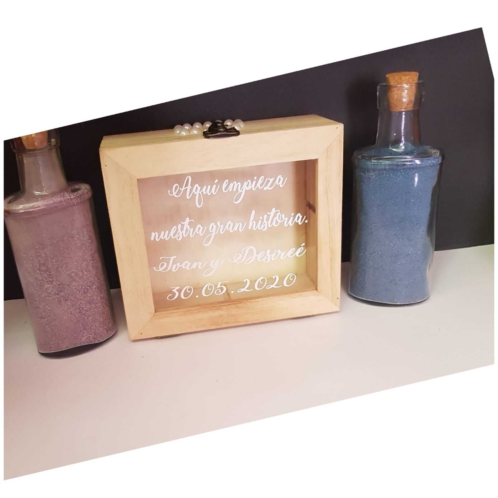 51,45 €. Pack personalizado para realizar el ritual de la arena de boda. Cuenta con marco personalizado (puedes añadir una foto de 12x12cm) con la grabación en madera del nombre de la pareja y la fecha del enlace (opcional), además de 2 botes con las iniciales de la pareja para las arenas. Podemos personalizarlo como quieras, habla con.