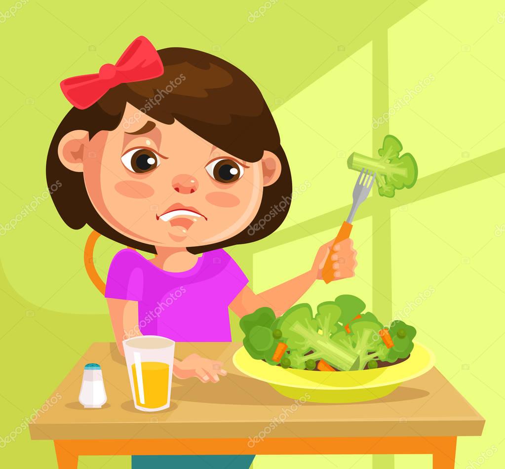 Niño personaje niña no quiere comer brócoli. Vector plano ilustración