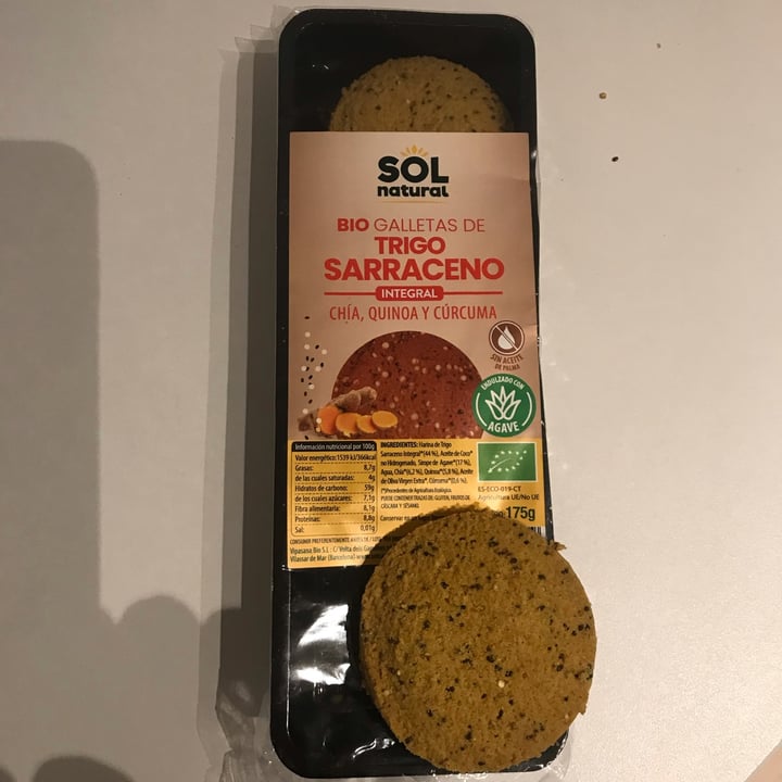 Descripción . Galletas Trigo Sarraceno de Solnatural, para satisfacer temporalmente el hambre. Indicación . Sol Natural es una empresa fundada en 1992 que distribuye una amplia gama de productos de alimentación sostenible y cultivados de forma respetuosa sin productos químicos.