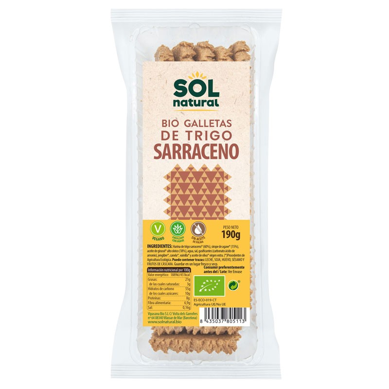 VEGANO. SIN LACTOSA. BIO. SIN AZUCAR. 3.30€ 3.69€ -10%. Información importante. Las galletas ecológicas de trigo sarraceno de Sol Natural, son totalmente veganas, y endulzadas únicamente con sirope de agave. Estas galletas son ideales para la temporada de invierno, ya que están condimentadas con las especias del momento: jengibre y canela.